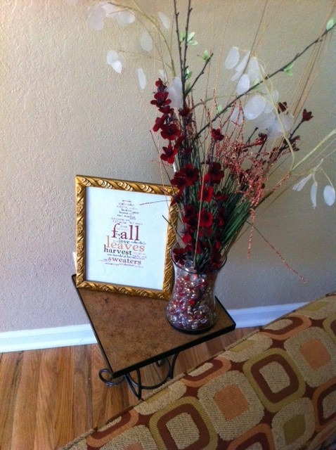 This picture sits on our downstairs mantle with the rest of the fall decor. Note the pinecones in the left of the picture, coutesy of mom and mom-in-law, who searched their yards for pinecones for Chelle to use this fall (as they are) and this winter (spray-painted and displayed in hurricane vases).